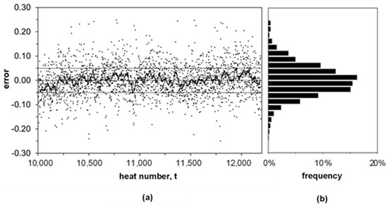 Prediction errors (with sign) of the final multivariate adaptive regression splines (MARS) model for the 2195 heats in the validation dataset: (a) Time evolution where each dot represents one heat and the solid curve represents the daily MAE (30 heat grouping) and (b) error distribution for individual heats.