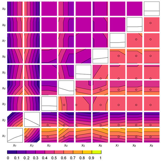 Graphical representation of the final MARS model {S = 1, I = 1, MF = 21, d = 2, L = 4, w = 2000} at heat number t = 11,755. The diagonal elements of the mosaic are the line plots of the predicted hot metal temperature, , versus each individual input variable, xi. The other mosaic elements are the response surfaces of the model for any combination of two variables (xi, xj); the contour plots below the diagonal are traced around the actual value of at t = 11,755: = (0.41, 0.14, 0.42, 0.38, 0.054, 0.53, 0.58, 0.61, 0.43) whereas the graphs above the diagonal are traced around the mid-point of the range of = (0.5, 0.5, 0.5, 0.5, 0.5) axes limits are [0,1] for all the variables.