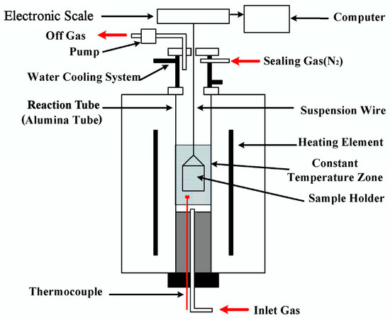 The experimental setup is schematically shown in Figure 1 and has been detailed elsewhere [23]. The following is an outline. The device comprised a gas supply system, an electronic balance with an accuracy ±0.001 g, and a temperature-controlled furnace with an accuracy of ±2 K. The furnace was heated by MoSi2 elements producing a 50 mm hot zone in the reaction tube with an inner diameter of 55 mm. The sample holder was made of a heat-resistance alloy (Fe-Cr-Al) wire.