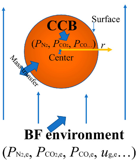 A CCB reaction model was established for the reaction of a single CCB in BF atmosphere. The model was based on the conservation of gas and solid species inside the CCB, and the mass transfer between the CCB and the environment. The concept of the model is shown in Figure 2. As the diameter and the height of each CCB were effectively the same, the shape of the CCB was considered to be spherical. The model was thus one dimensional in radial direction. The gas phase in the model was an ideal gas, and the gas-phase species included CO, CO2, and N2. Solid phase species were Fe2O3, Fe3O4, FeO, Fe, and C. Other assumptions in the model development were: (1) the CCB volume was constant throughout the reaction process and (2) the mass transfer by convection was not considered, and (3) the involved reactions were those given in Table 2.