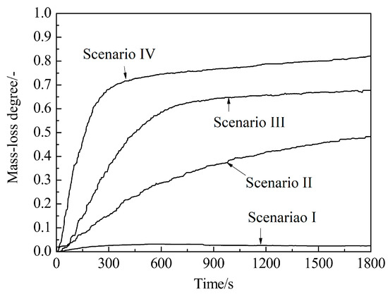 Isothermal reaction tests were conducted under four scenarios and they are listed in Table 4. The four scenarios were designed to simulate the BF in-furnace conditions according to the typical gas composition–temperature profile of the BF [33]. The results are shown in Figure 6. It could be seen that the CCB mass loss was negligible under scenario I, and became observable under scenarios II, III, and IV.