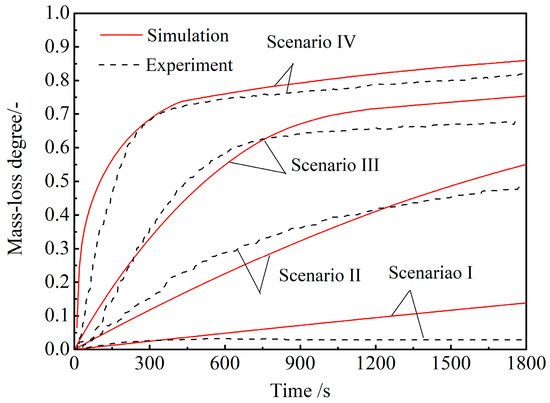 Comparison of the mass-loss degree curves between the model predictions and the experiments.