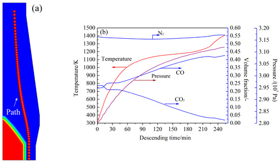 The actual BF environment was obtained from the simulation results [34] of a BF of 2500 m3 with a productivity of 6250 ton hot-metal per day. CCB reaction behavior along a burden flowing path near the BF mid-radial zone was investigated (Figure 8a). The scope of the path for investigation was from the burden surface to the upper surface of the cohesive zone (CZ). Along the path, variations of gas pressure, gas composition, and solid temperature with the solid descending time were obtained and have been plotted in Figure 8b. In Figure 8b, the CCB descending time was counted from the burden surface and was calculated using where s is the distance on the path from the burden surface (m) and is the burden descending velocity (m/s). Changes of the gas velocity along the path were also needed; however, they were not plotted here for brevity. Thus, in the simulations, at a given time t, the environmental variables were equal to their corresponding BF variables forming the boundary conditions of the model.