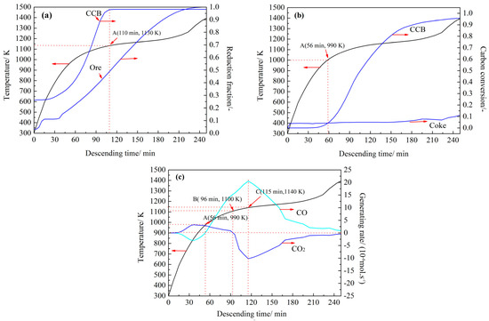 Figure 9a shows the changing reduction behavior of CCB iron oxide. Compared with the ore particles, the reduction of CCB iron oxide proceeded considerably faster; and moreover, the CCB reached full reduction after 110 min (1130 K). Figure 9b shows the gasification behavior of the carbon in the CCB along the path. Compared with the coke particles, the CCB carbon exhibited a considerably higher CO2 reactivity after the temperature reached 990 K (56 min). The CCB carbon conversion was high at 0.90 when the CCB reached the CZ. Figure 9c displays the changes of CCB generation rates of CO and CO2. In Figure 9c, the generation rates of CO and CO2 were calculated via and , respectively. In the early stage, the CCB produced CO2 and consumed CO from the BF gas. In the period from 56 (990 K) to 96 min (1100 K), it contributed both CO and CO2 to the BF gas. Thereafter, it produced CO and consumed CO2 from the BF gas. After 115 min (1140 K), the CCB reached its maximum rate of carbon gasification.