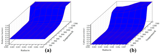 Figure 9 shows some simulated results of the CCB reaction behavior along the path. In Figure 9a,b, changes of the reduction fraction of the ore particles and the carbon conversion of coke particles are also plotted. Data of the ore particles and the coke particles are from the BF simulations.
