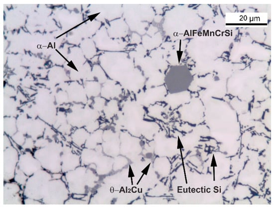The α-Al15(Fe,Mn,Cr)3Si2 and Al2Cu phases were also identified as frequent intermetallic compounds (Figure 2). Besides Al2Cu phase, another Cu-containing phase was occasionally observed in the AlSi9Cu3(Fe) alloys and identified as Q-Al5Mg8Cu2Si6 phase [31].