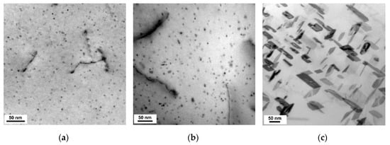 Before thermal exposure, fine precipitates with an average size of few nanometers are found throughout the α-Al matrix (Figure 4a); when the alloy is thermal treated at 150 °C for 30 min, the density of fine and slightly coarser precipitates seems to increase (Figure 4b). At 200 °C, the fine precipitates completely disappear, and coarse platelets with {100}Al habit plane appear in the α-Al phase (Figure 4c).