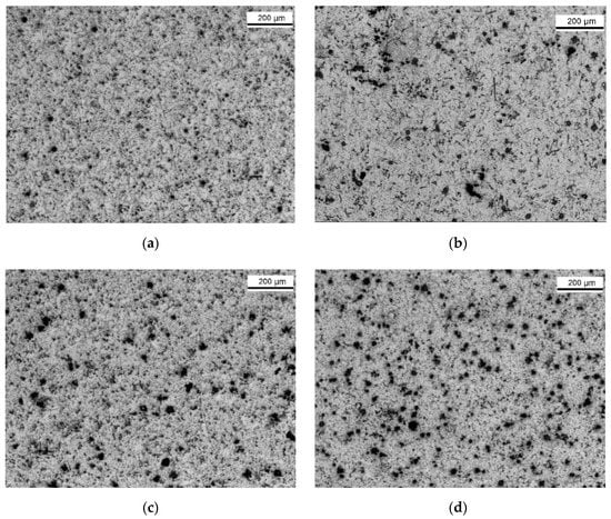 The microstructures of the center of the plates produced with different Fe, Mn, and Cr contents are reported in Figure 5. The α1-Fe sludge particles, appearing as dark compounds after chemical etching, generally assume star-like and polyhedral morphologies. Their amount and dimensions increase by increasing the Fe, Mn, and Cr levels in the alloy, in accordance with the SF value obtained through Equation (1). The graph in Figure 6 shows the sludge fraction of the experimental alloys as a function of their sludge factor; the sludge amount increases proportionally with the SF. At the same time, more α2-Fe particles form and, therefore, the volume fraction of these increases. However, it has been recently demonstrated how the sludge formation prevails over the whole precipitation of α-Fe phase [37].