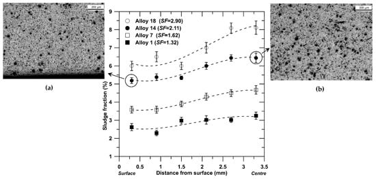 Evolution of the area fraction of sludge particles along the cross section of the plates die cast with different experimental alloys, here indicated with their sludge factor (SF), which was calculated according to Equation (1). The micrographs refer to (a) the casting surface and (b) the center of the plate (Alloy 14); the Fe-rich particles appear dark in the etched microstructures.