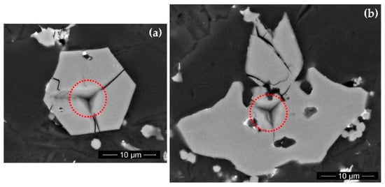 Nanoindentation tests were performed on sludge particles to verify their individual specific hardness. As found in [36], the different contents of iron, manganese, and chromium in the experimental alloys lead to a variation of the chemical composition of the sludge particles and, potentially, their mechanical properties. Therefore, sludge particles in three alloys with different iron, manganese, and chromium levels (Alloys 1, 13, and 18) were analyzed. In addition, the relationship between sludge morphology and the hardness was also investigated by testing polyhedral and star-like particles in Alloy 18 with the highest sludge fraction (Figure 8).