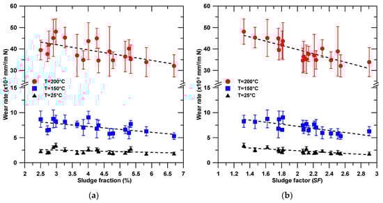 Figure 10a shows the average wear rate of the experimental AlSi9Cu3(Fe) alloys against the area fraction of sludge compounds for the different testing temperatures. The wear rate decreases progressively with the sludge fraction, and this behavior is even more pronounced by increasing the temperature during wear testing. On the other side, the variations of the wear rate at different temperatures well fit with the sludge factor too (Figure 10b). The results suggest that for the testing conditions considered in this study, the wear rate of the diecast AlSi9Cu3(Fe) alloys may be predicted by the SF of the alloy using a linear regression model. The slope of the fitting curves reported in Figure 10 increases progressively by increasing the temperature from room temperature up to 200 °C. The wear rate (in mm3/m·N × 10−3) can be statistically modelled for the different temperatures using a relationship of the type: