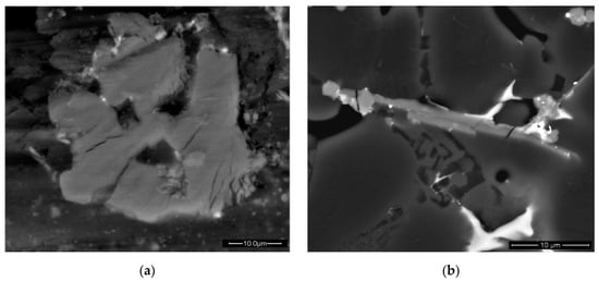 Upon increasing the Mn and Cr levels such as in Alloys 15 and 18, the amount and the dimension of sludge compounds notably increase if compared with the diecast AlSi9Cu3(Fe) base alloy (see Figure 5c,d). Needle-like β-Fe particles are also observed, but they appear smaller compared with those in Alloy 13; moreover, the morphology of sludge seems to change towards a more irregular and star-like shapes.