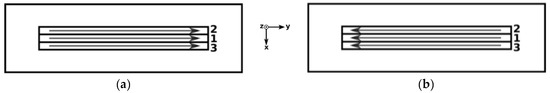 The experiment used for validation was performed by Denlinger et al. [26]. In it, a wall was built on a substrate plate using directed energy deposition (DED). Two cases of DED of alloy 625 presented in that paper were selected for this work. They differed with respect to the dwell time between each layer. One case had no dwell time and the other had a dwell time of 20 s between each layer. The wall was 101.6 mm long, 38.1 mm high, and 6.7 mm wide, and the substrate plate was 152.4 mm long, 38.1 mm wide, and 12.7 mm thick. The deposit was made using a laser power of 2 kW and a scan speed of 10.6 mm/s. The wall consisted of 42 layers, and each layer was comprised of three passes. The layer thickness used in the simulations was 0.9 mm. Figure 1 shows the scan sequences during the deposition. Figure 1a shows the sequence for odd-numbered layers and Figure 1b shows the case for even-numbered layers.