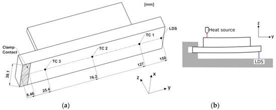 The measurements of temperature, displacements, and residual stress were used to validate the simulations. The temperature was measured by three thermocouples and the deflections by a laser displacement sensor (LDS) at the positions shown in Figure 2a. The LDS measures the distortion of the substrate along the z-direction, see Figure 2b. The residual stress was measured at the location of TC2 using the hole drilling method defined in ASTM E837. The method has an accuracy of ±50 MPa if all requirements are met. The method measures the absolute residual stress at a point, including the residual stresses incurred when the material is prepared. The preparation of the substrate in the experiment is not specified in [26].