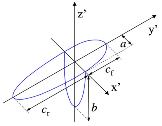 The double ellipsoidal heat source model is described by a moving local coordinate system. The heat source is moving in the -direction according to Figure 3. The heat source consists of two elliptic regions, one at the front of the origin, described by Equation (1),