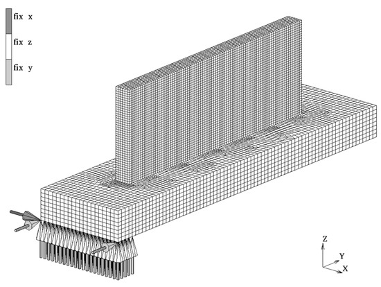 Model with fine mesh. The arrows indicate the mechanical boundary conditions used for all models.