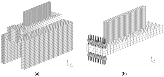Simulation models. In (a) the fixture is meshed and in (b) the fixture is replaced by a convective boundary condition represented by the arrows.