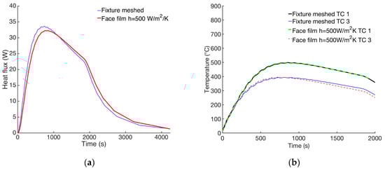 Comparison of the total heat loss from baseplate to fixture (a) and the temperature in positions TC 1 and TC 3 (b) for the model with meshed fixture and the model with the fixture replaced by a convective boundary condition.