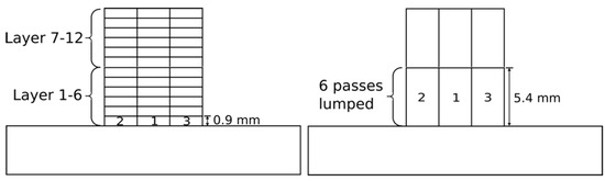 The coarse model shown in Figure 5b still requires considerable computing time. The effect of the lumping of welds has been studied with respect to efficiency and accuracy. The lumping procedure is explained with reference to the specific case of lumping six weld passes into one. The lumped model was created by merging six passes in the height direction into one. A general sketch of the lumping procedure can be seen in Figure 7. The largest element size in the height direction was determined by the layer thickness. In this case, there was the possibility to coarsen the mesh when lumping was utilized.
