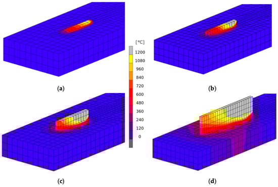 The first pass added in the simulation. The legend is expressed in °C. (a) No lumping for the model with coarse mesh. The height corresponds to the real thickness of one DED layer. (b) Lumping of three layers. The height corresponds to the thickness of three DED layers. (c) Lumping of six layers. (d) Lumping of 14 layers.