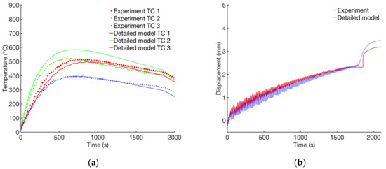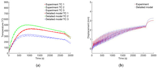 The simulated results from the detailed model with respect to temperature and displacement are in good agreement with the measurements. However, the temperature at the TC 2 location in the case with no dwell time between layers is an exception. This can be seen in Figure 9a; the temperature registered by TC 2 is higher than that registered by TC 1 at the beginning, but it then decreases so that the two curves cross after around 1000 s according to the measurements in [26]. This behavior is not shown in the simulation and there is no realistic explanation for this occurrence. None of the other similar cases in [26] show this behavior.