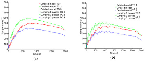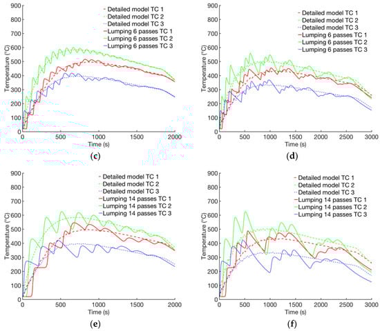 The temperatures are compared at the locations of the thermocouples in the experiment; see Figure 2a. The temperature results for the cases with no dwell time and with 20 s dwell time between layers for lumping of 3, 6, and 14 passes are shown in Figure 11. They are compared with the reference model with fine mesh, which is denoted in the figure as the detailed model.