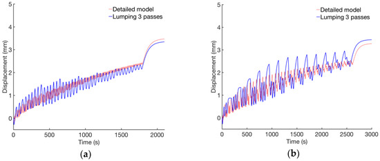 The results also show that the lumping technique works better for the cases without dwell time, which correspond to the left column in Figure 12. The final displacements deviate more when there is a dwell time between each pass; see Table 6. The reason is that the procedure applied will extend the dwell time with a multiple corresponding to the number of lumped passes. Because of this, the material is cooled down excessively before the next layer is added. This mismatch in temperature between the existing material and the added filler material causes additional plasticity. A better prediction of the final geometry is achieved if the time schedule of the added welds is adjusted so that cooling of the existing material is more similar to that in the real process. The drawback with that approach is that a lumped model is needed to estimate this beforehand. An example of this is shown in Figure 14, where the original approach is compared with a simulation in which the dwell time is halved.
