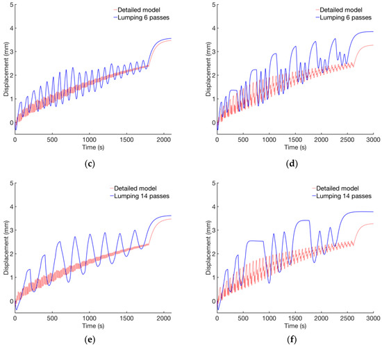 The computed displacements for the model with fine mesh compared with those with lumping of 3, 6, and 14 passes. The models with no dwell time between layers are shown in (a), (c) and (e) whereas (b), (d) and (f) show the same results for the cases with 20 s dwell time.