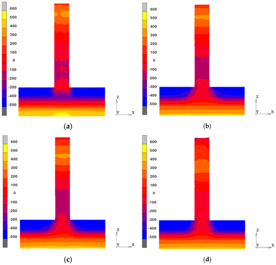 Residual stress in the welding direction (MPa) in the mid cross section of the case with no dwell time between layers for the model with fine mesh (a), and the models with lumping of three passes (b), six passes (c), and 14 passes (d).