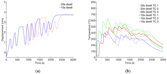 Computed displacement (a) and temperature (b) for lumping 14 passes for the case with 20 s dwell time between layers compared with a model where the dwell time between layers is reduced to 10 s.