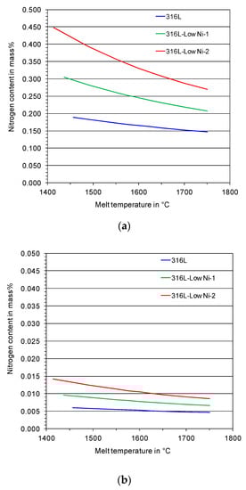 Nitrogen solubility in the austenitic stainless steels decreases with increasing melt temperature and decreasing nitrogen partial pressure (see Figure 1). The nitrogen solubility increases significantly as the manganese content is increased and the nickel content is reduced. For example, it is approximately 0.15 mass % for 316L at 0.1 MPa N2 at a melt temperature of 1700 °C, while it is about 0.22 mass % and 0.29 mass % for the 316L-Low Ni-1 and the 316L-Low Ni-2 respectively. At 100 Pa N2, the nitrogen solubility in the steel melts is much lower: only 50–150 ppm in the melting temperature range of the steels.