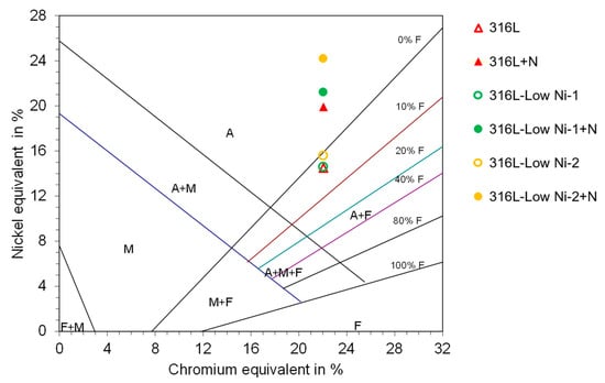 The position of the steel alloys 316L, 316L-Low Ni-1, and 316L-Low Ni-2 with and without the addition of nitrogen is plotted in the Schaeffler diagram (see Figure 2). The nitrogen content of the steels with added nitrogen is calculated at 0.1 MPa N2 at the pouring temperature as listed in Table 2. With the addition of nitrogen, the nickel equivalent is significantly increased. The 316L-Low Ni-2 shows the highest tendency to form austenite.