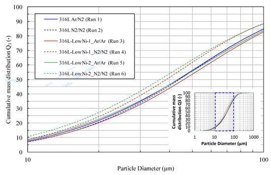 The cumulative mass distributions (Q3) of the particles are shown in Figure 3. The particle size distribution of the steel powders seems to be unaffected by the alloy composition and the melting atmosphere. However, in Figure 3, the particle size distribution of the 316L-Low Ni-1 (Run 4) and 316L-Low Ni-2 powder (Run 6) shifts to the left, indicating that finer particles are produced. The median diameter d50 is 39–41 µm for the two powders, while it is 46–49 µm for the other powders. A possible reason for this deviation is as follows: the pouring temperature of the melts in experiment run 4 and 6 is 40 to 50 °C higher than that of the other experiments, resulting in a lower viscosity and surface tension of the melts, and thereby producing a smaller atomized droplet size. The gas-atomized particles typically show a spherical shape and smooth surface, with a few observed satellite particles (see Figure 4).