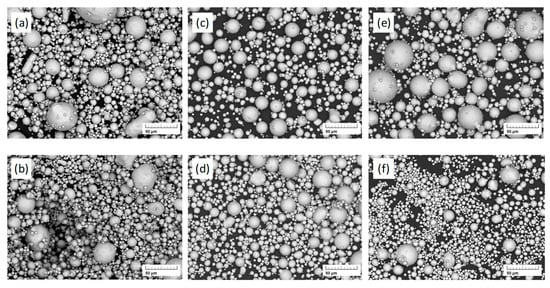 SEM images of gas atomized 316L and modified 316L steel powders (particle size < 200 µm): (a) 316L Ar/N2 (Run 1), (b) 316L N2/N2 (Run 2), (c) 316L-Low Ni-1 Ar/Ar (Run 3), (d) 316L-Low Ni-1 N2/N2 (Run 4), (e) 316L-Low Ni-2 Ar/Ar (Run 5), and (f) 316L-Low Ni-2 N2/N2 (Run 6).