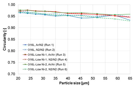 Circularity of the gas atomized 316L and modified 316L steel powders.