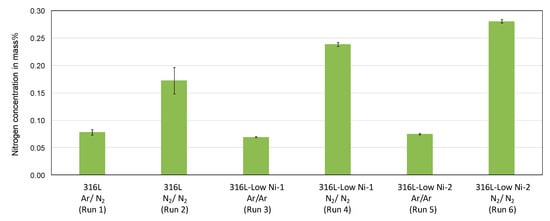 The nitrogen content in the feedstock (316L and modified 316L prepared by inductive melting and casting) is 200–300 ppm. It is increased in the atomized particles (see Figure 6). When melting under an argon atmosphere, the nitrogen content is 600–800 ppm, independent of the chemical composition of the stainless steels. Under a nitrogen atmosphere, the nitrogen pick-up is significantly increased. The addition of manganese in the austenitic stainless steel also contributes significantly to the pick-up of nitrogen in the steel.