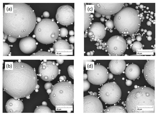 SEM images of gas-atomized powder (particle size 20–63 µm): (a) 316L-Low Ni-1 Ar/Ar (Run 3), (b) 316L-Low Ni-1 N2/N2 (Run 4), (c) 316L-Low Ni-2 Ar/Ar (Run 5), and (d) 316L-Low Ni-2 N2/N2 (Run 6).
