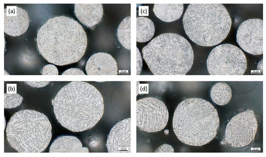 Optical micrographs of gas-atomized powder (particle size 20–63 µm): (a) 316L-Low Ni-1 Ar/Ar (Run 3), (b) 316L-Low Ni-1 N2/N2 (Run 4), (c) 316L-Low Ni-2 Ar/Ar (Run 5), and (d) 316L-Low Ni-2 N2/N2 (Run 6). The samples were etched with V2A etchant at 60 °C for 30 s.
