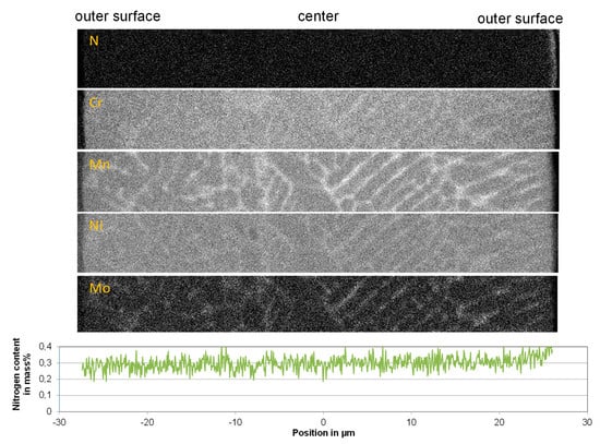 Element mapping (EPMA) on the cross section of the particles show that the nitrogen distribution in the particles is relatively homogeneous. Between the outer surface and the core of the particles, no nitrogen concentration gradient is observed, as represented in Figure 9. The average nitrogen concentration of the 316L-Low Ni-2 powder particles processed under a nitrogen atmosphere is about 0.3 mass %, which is in good agreement with the measured results in Figure 6. Slight segregation of chromium is seen by element mapping, while the segregation of the alloying elements manganese, nickel, and molybdenum in the dendrite structure of the particle is more significant. Since the segregation occurs in micrometer scale, it could have a very limited effect on the laser additive manufactured parts.