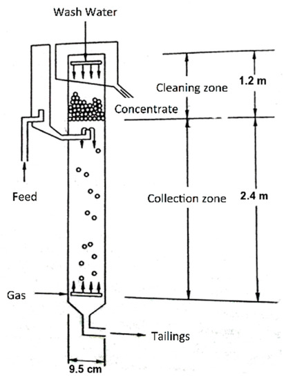 Since flotation is a process widely used for mineral concentration, the study of size and quantity of bubbles, the particle sizes and hydrophobic conditions, and many other factors are of great importance [13]. According to this, mineral extraction from tailing is a technological challenge in mining and metallurgical operations. It needs an in-depth study of technical and economic feasibility [14], being the flotation an adequate technique for the concentration and recovery of minerals from ores and waste. The flotation in column also represents an appropriate option for the recovery and or concentration of minerals, where the model studied is related to a stable state behavior, taking in account variables such as dynamic mass balance, type of pulp, markers, bubble distribution and flux, bubble size, cations effect, and bubble coalescence, among others [15,16,17].