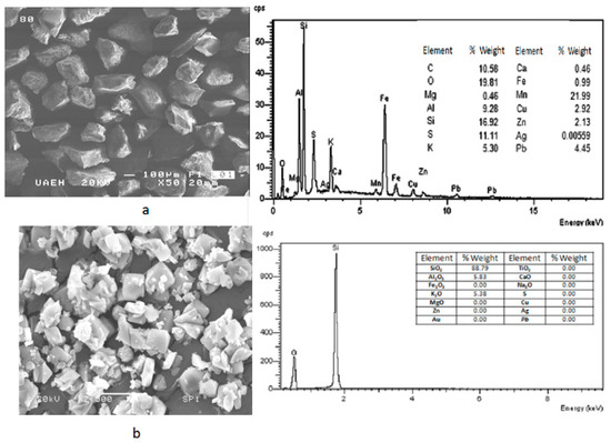 The results obtained by SEM-EDS are shown in Figure 2, where can be seen the general morphology of samples (Saning Electron Microscopy–Secondary Electrons (SEM-SE)) and its punctual composition obtained by EDS (a) before flotation stage, and (b) after flotation process. It can be noted that after the flotation of material, the residue resting has been enriched with SiO2.