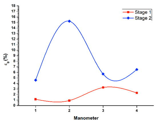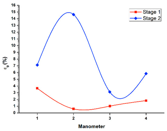 Similarly, Figure 5 (stage 2 line) illustrates the determination of retained gas (εg) in the columnar flotation system, for the recovery in the batch system during the second cleaning stage, with a flow of liquid in the tail stream (JLT) of 0.68 cm/s, applying the gas flow (Jg) of 0.3 cm/s. In the middle zone of the flotation column (manometers 2 and 3), there was an increase in the concentration of the retained gas. This decelerated the ascent speed, and the recovery decreased, overloading the surface of the bubble with mineral. On the other hand, at the end of the flotation column, low concentrations of retained gas were present, and, therefore, higher rising rates of the bubble package. This result was more evident in the upper part of the column. Concerning global retained gas, a value of 5.9% is shown.