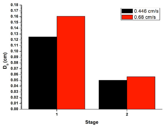 Similarly, Figure 4 shows the bubble size (Db) generated in the disperser, for the recovery in a batch system, with a flow of liquid in the tail stream (JLT) of 0.45 cm/s, applying the gas flow (Jg) of 0.3 cm/s. The bubble size decreased between the two cleaning stages, thus generating an increase in gas retained in the system, as well as an increase in the superficial flow of bubbles. This, in turn, decreases the rising speed of the bubble pack, causing a lower recovery in the second stage.