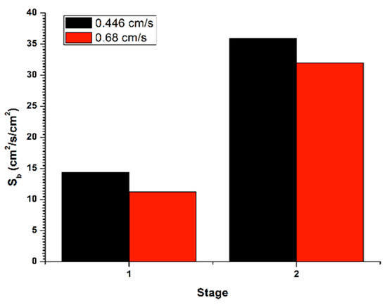 Figure 6 (stage 1) shows the determination of the bubble surface flow (Sb) from εg and Db, for the recovery in batch system, with a flow of liquid in the tail stream (JLT) of 0.45 cm/s, applying the gas flow (Jg) of 0.3 cm/s. The bubble surface flow increased between the two cleaning stages, thus generating an increase in gas retained in the system. Such effect was provided by a decrease in the initial bubble size from the first stage to a final one, in the second stage. Moreover, in Figure 6 (stage 2) is exposed the determination of the bubble surface flow (Sb) from εg and Db, for the recovery in a batch system, with a flow in the stream of tails (JLT) of 0.68 cm/s, applying the gas flow (Jg) of 0.3 cm/s. The bubble surface flow increased within the two cleaning stages, thus causing an increase in gas retained in the system. Such effect was provided by a decrease in the initial bubble size from the first stage to a final one, in the second stage. This, in turn, caused a reduction in the rising rate the bubble pack and, accordingly, a lower recovery in the second stage.