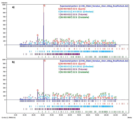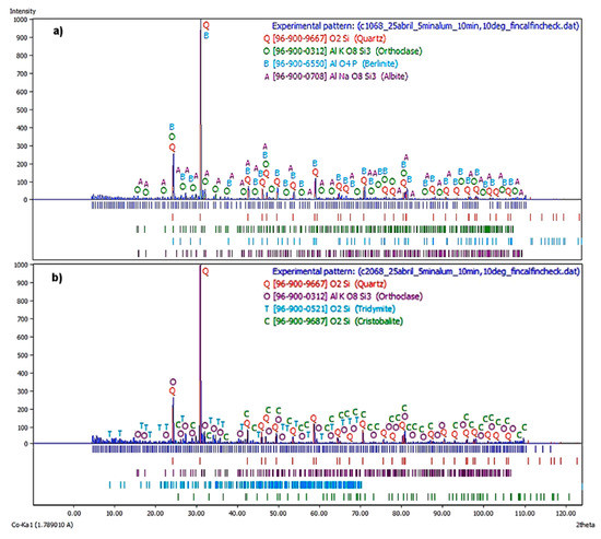 On the other hand, Figure 8a shows the X-ray diffractogram corresponding to the first flotation stage at a JLT = 0.68 cm/s. The principal phases were quartz, orthoclase, and berlinite, where the albite was the remaining phase. Note that due to an increase in liquid flow rates, there were more feldspathic phases and a phase analogous to quartz, although the major one was still quartz, concerning the same stage and at a JLT = 0.47 cm/s.