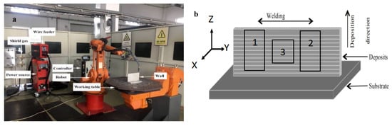 The additive manufacturing system is shown in Figure 1a. The system included a Fronius Advance 4000 arc welding power supply and an ABB 1410 welding robot. The additive manufacturing process is shown in Figure 1b. The x-axis corresponds to the front of the wall, the y-axis corresponds to the heat source movement direction, horizontal along the wall, and the z-axis corresponds to the direction of growth, perpendicular to the wall.