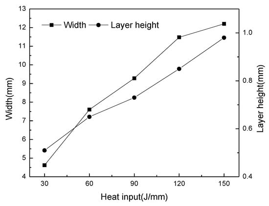 The thickness and layer height of the deposits changed with the heat input are shown in Figure 2. As can be seen from the figure, the thickness and layer height of the deposits gradually increased with increasing heat input. Due to the enlargement of heat input, the width of the molten pool improves, resulting in an increase in thickness. The relationship between the thickness of deposits and the heat input satisfies the function: y = 4.7992ln(x) − 11.882. The increase of layer height is due to the unified control of the welding machine and the amount of feeding wire built up with the increase of heat input. The relationship between layer height and heat input satisfies the function: y = 0.0038x + 0.402. According to the two functions, the appropriate heat input can be selected according to the target wall thickness and later determines the suitable height during WAAM process.