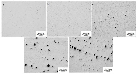 Pores of deposits with different heat input. (a) 30 J/mm; (b) 60 J/mm; (c) 90 J/mm; (d) 120 J/mm; (e) 150 J/mm.