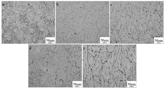 Microstructure of deposits with different heat input in T6 state. (a) 30 J/mm; (b) 60 J/mm; (c) 90 J/mm; (d) 120 J/mm; (e) 150 J/mm.