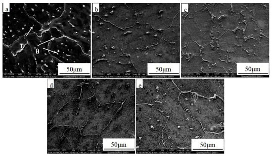 Among them, Ce represents the content of Cu in the eutectic structure, and its value is 0.33; C1 is the mass fraction of Cu in the alloy, its value is 0.05, and k0 is the equilibrium distribution coefficient of the Cu element, taking the value of 0.17. It can be seen from the formula that the heat input does not have much influence on the content of the eutectic structure in the deposit. However, it can be seen from Figure 5 that the heat input has a greater effect on the morphology and distribution of the θ phases. As the amount of heat input increases, the number of precipitated θ phases in the grain gradually decreases, and their number on the grain boundaries increases. The size increases are shown in Figure 5a–c. When the heat input amount reaches 120 J/mm, the precipitated phases in the grains basically disappear, as shown in Figure 5d. When the heat input reaches 150 J/mm, the number of large-scale massive precipitated phases on the grain boundaries increases and there is segregation, as shown in Figure 5e. When the size of the precipitated θ phase is large, the potential energy barrier for them dissolve into the matrix is increased. Conducive to the dissolution of the θ phase in the solid solution process.